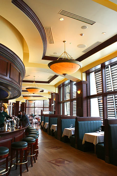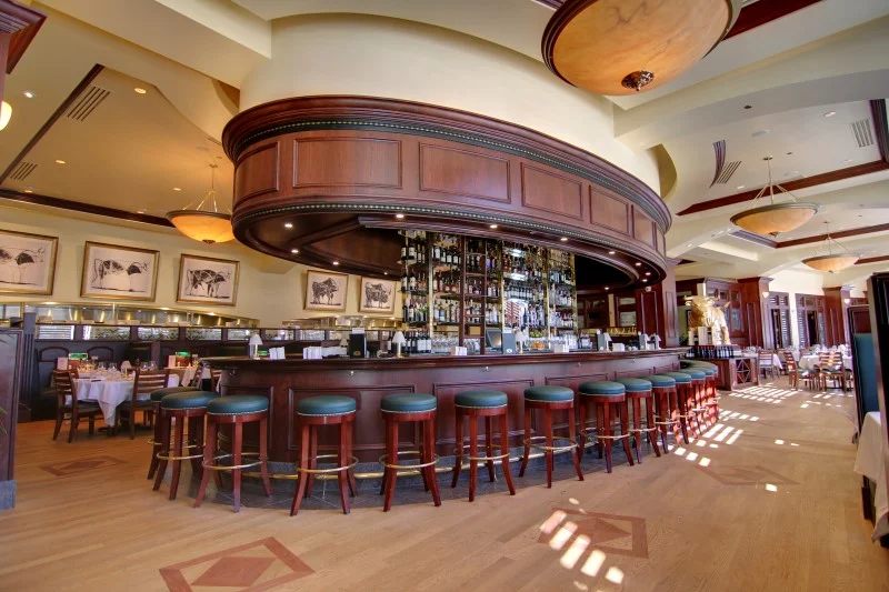 This space was originally a modern restaurant. However, 801 Chophouse's concept is extremely traditional. Our challenge was adapting the dark cherry and brass motifs to the dramatically contemporary building architecture. The treatment of the exterior windows with long shutters and the striking oval bar in the center of the space brought the two styles together into St. Louis' favorite steakhouse.