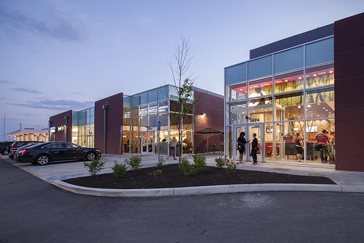 Retail on a busy road like Hanley does not have be a sea of cars with no human scale. Our solution of pulling the building to the street and parking in back not only maximized the rentable area, but also increased visibility for the tenants. Additionally, by re-routing two neighborhood roads, we were also able to create a better buffer between the residents behind and this busy thoroughfare.